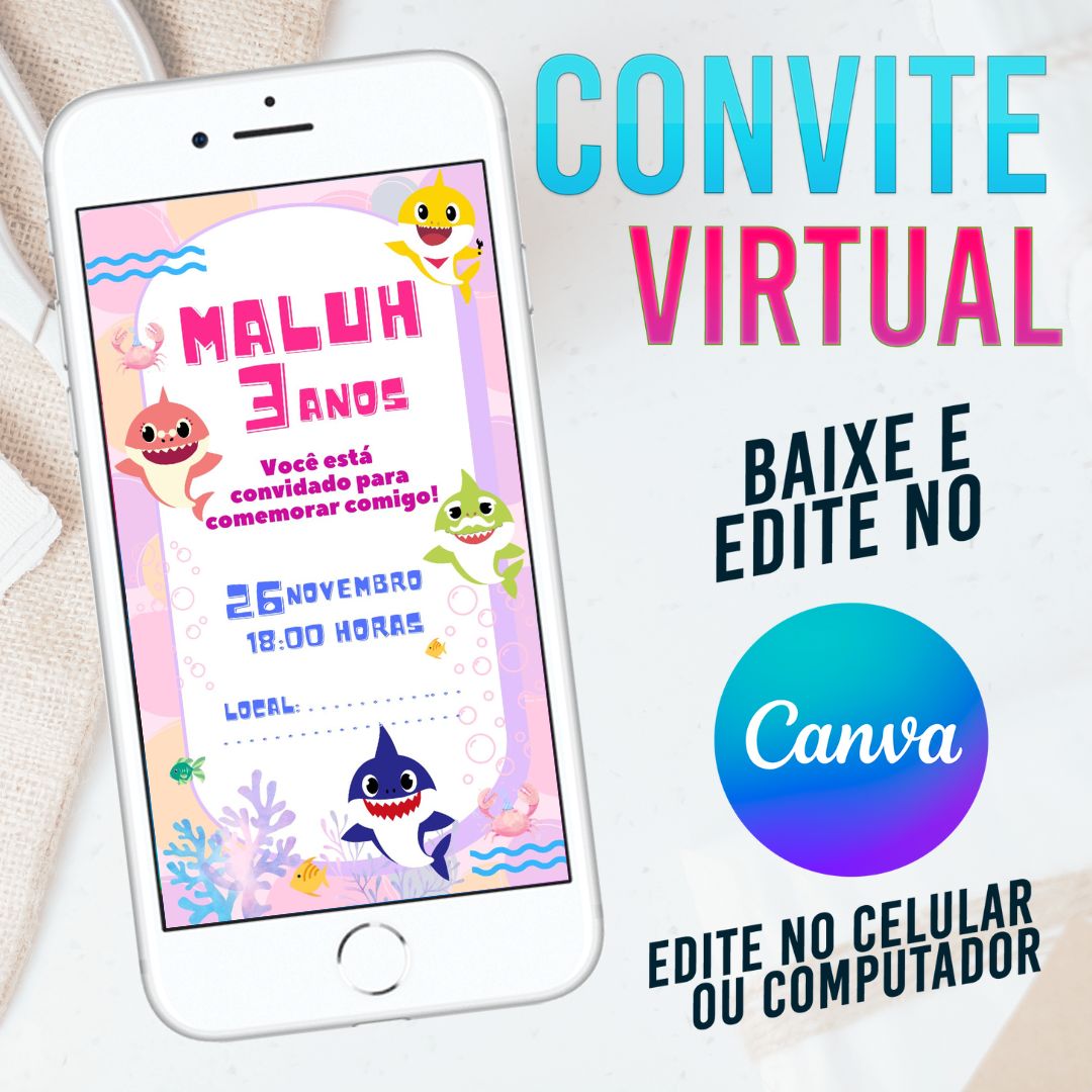 Baby Shark convite Editável no Canva. Convite Virtual Baby Shark. Convite Virtual Baby Shark Template Canva.
