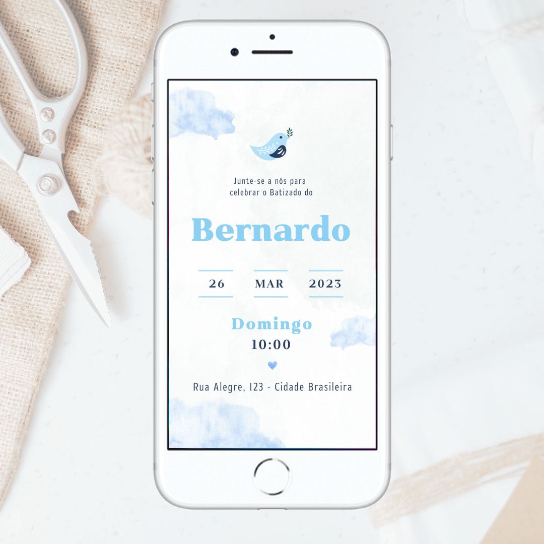 Convite Retrato Batizado Azul Pássaro CB0005.