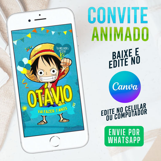 One Piece Luffy Convite Animado editável no Canva. Festa One Piece Luffy. Convite animado One Piece Luffy. Template Convite One Piece Luffy.
